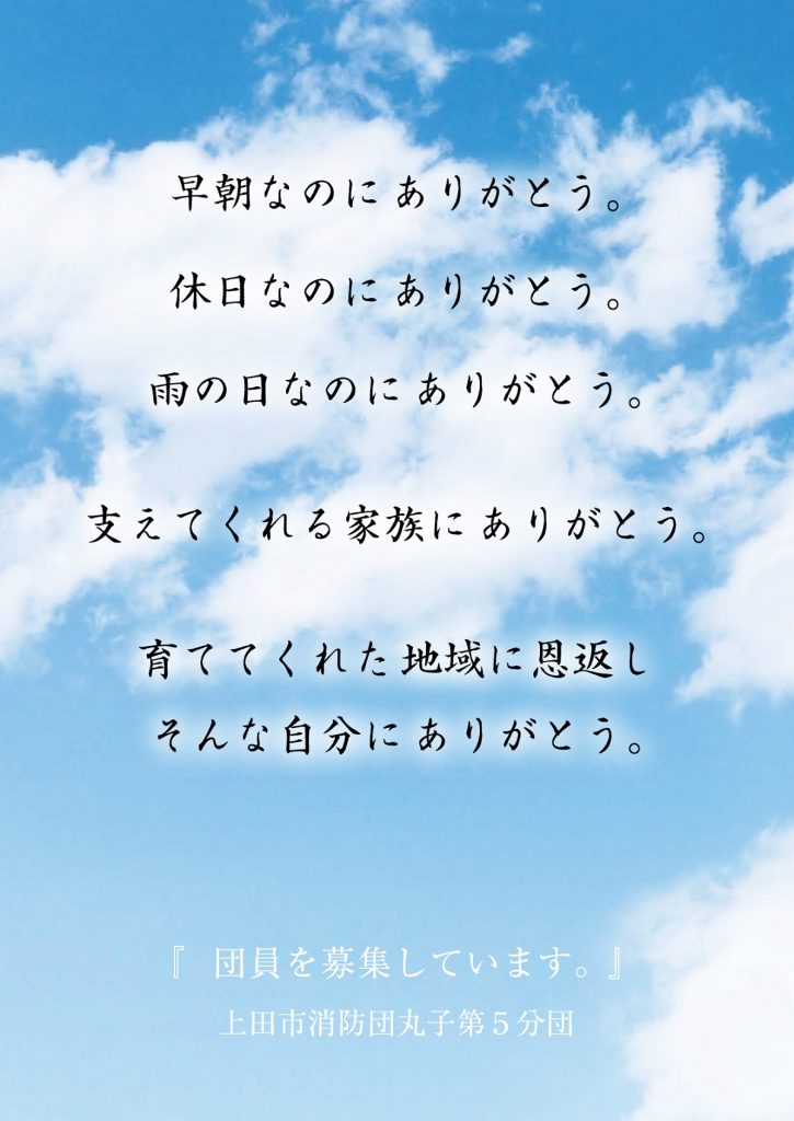 地域の仲間たちとの消防団活動のありがとうの輪のなかで一緒に活動してくれる新しい仲間たちを募りたいという思いで制作しました。