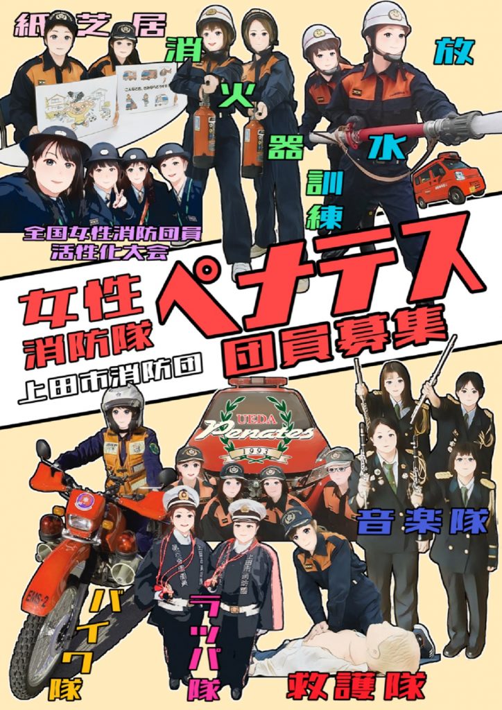 女性消防隊ペナテスは、分団と音楽隊、学生の女性団員で構成されています。防火・防災の予防広報やオリジナルキャラクターの防災紙芝居を使って啓発活動などを行っています。