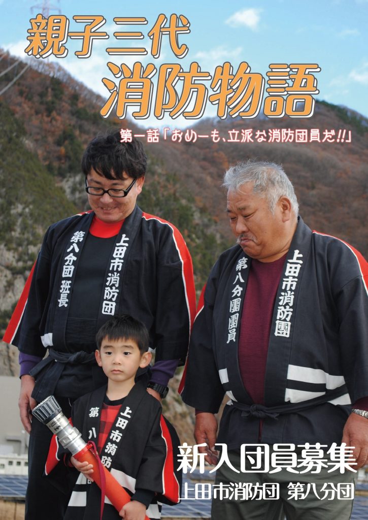 「我が郷土 地域の絆で」をモットーに、地域に根差した消防団活動を行っています。今年度は、世代を越えて伝統を受け継いでいる様を表現し、消防物語ポスターを作成しました。